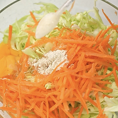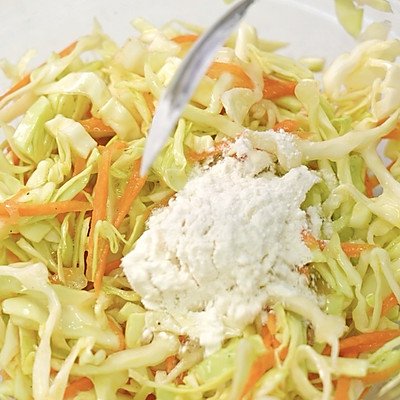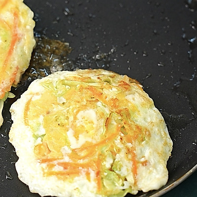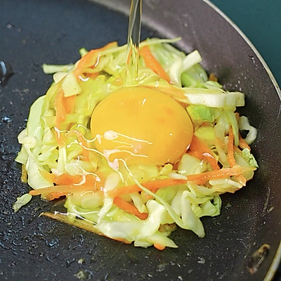 步骤9、平底锅刷油,放入蔬菜馅,中间挖一个小洞