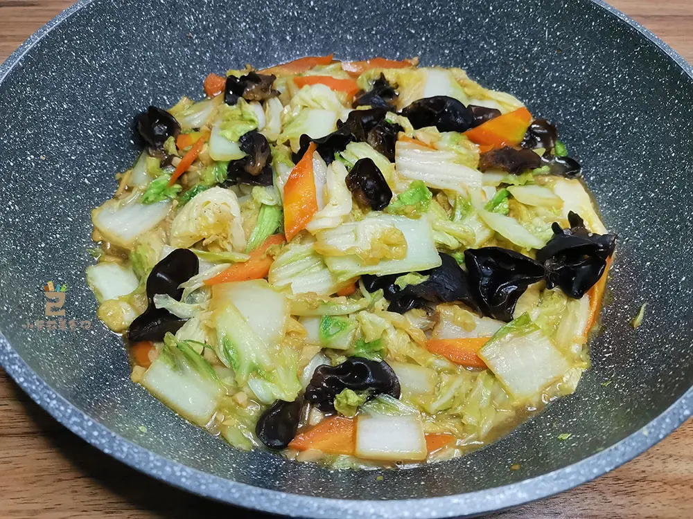 4、起锅放油,葱蒜都加到里边,胡萝卜倒进去,多炒一会儿,接着放白菜和木耳,加酱油,蚝油,盐,炒一会儿,调味料均匀混合。最后淋一些芡汁,这样食材会更入味。汤汁收浓稠后装盘。