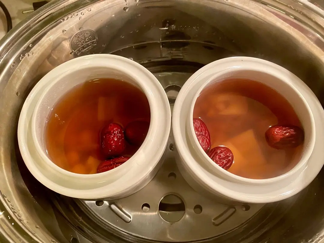 4、食材都放到炖盅里边,接着吧开水倒进去。再放入炖锅,炖差不多一个小时,彻底炖透后即可。