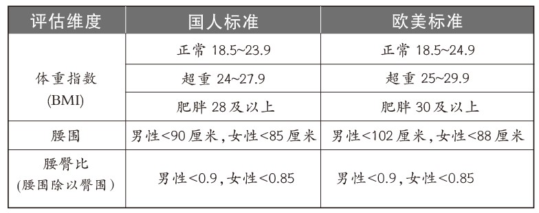 “用欧美标准(体重指数在30及以上为肥胖)衡量国人,会漏掉近70%的高风险人群。”纪立农解释,我国居民对肥胖的“耐受度”远低于欧美人群,当体重指数[BMI=体重(公斤)÷身高(米)的平方]达到24(即欧美标准正常上限)时,高血压风险就会增加2.8倍;BMI在28及以上时,2型糖尿病风险飙升4.3倍,相当于欧美居民BMI达到30及以上的风险水平。同时,即便BMI正常,我国男性腰围在90厘米及以上、女性在85厘米及以上,代谢综合征风险仍会增加1.9倍。因此,我国的“健康体重线”应比欧美更严、更精准(如表)。