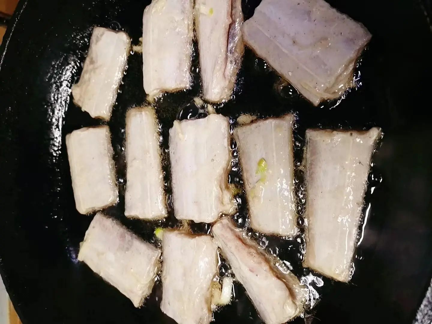 3、在表面撒点地瓜粉,均匀裹满。接着在锅里倒上油热透,葱姜也加一些,鱼块摆进去,中等火煎到两面金黄时夹出即可。