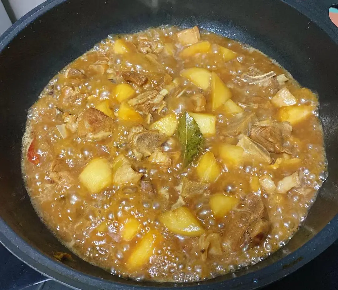 4、往里边添上热水,炖一个小时左右。切点大块的萝卜倒里边,补点盐到汤汁中,翻炒匀后再焖四十分钟,软烂入味后关火。