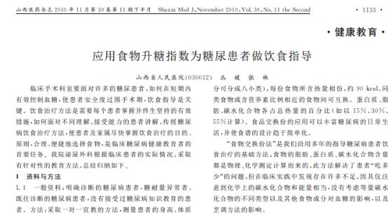 [1]丛媛.应用食物升糖指数为糖尿患者做饮食指导, 山西医药杂志(下半月刊) ,2010-11-25