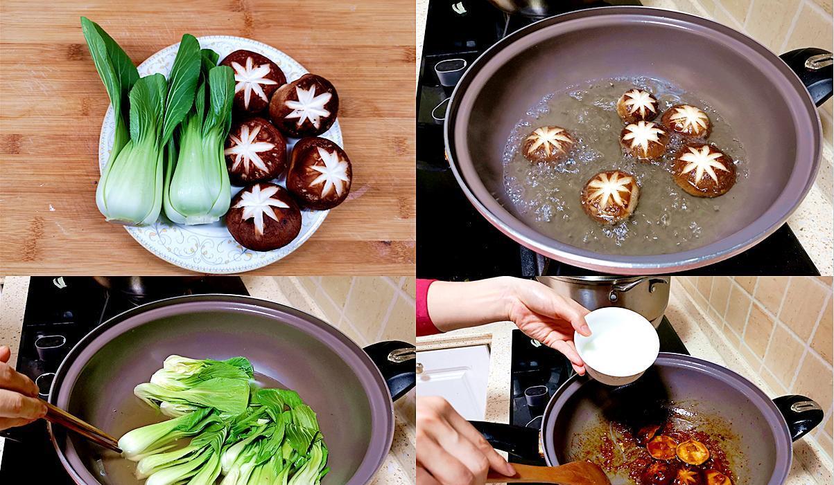 1. 鲜香菇去菌柄,菌盖洗净,表面打上十字花刀(更好看也更入味)。油菜洗净,对半切开或保持整棵。