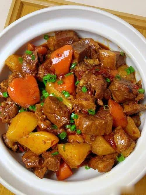 5. 放入胡萝卜块继续炖煮 30 分钟左右,加入盐、生抽调味,大火收汁即可。