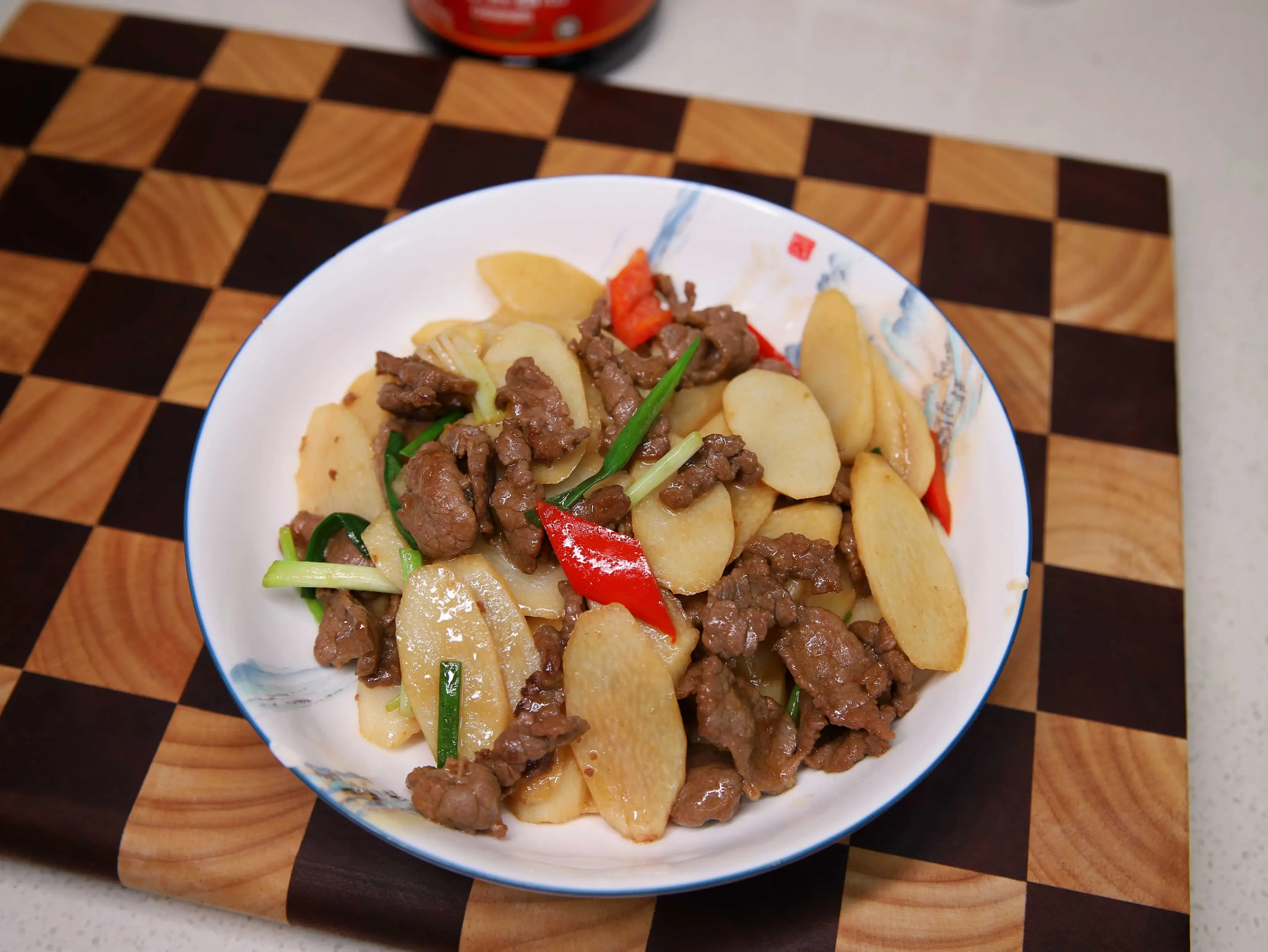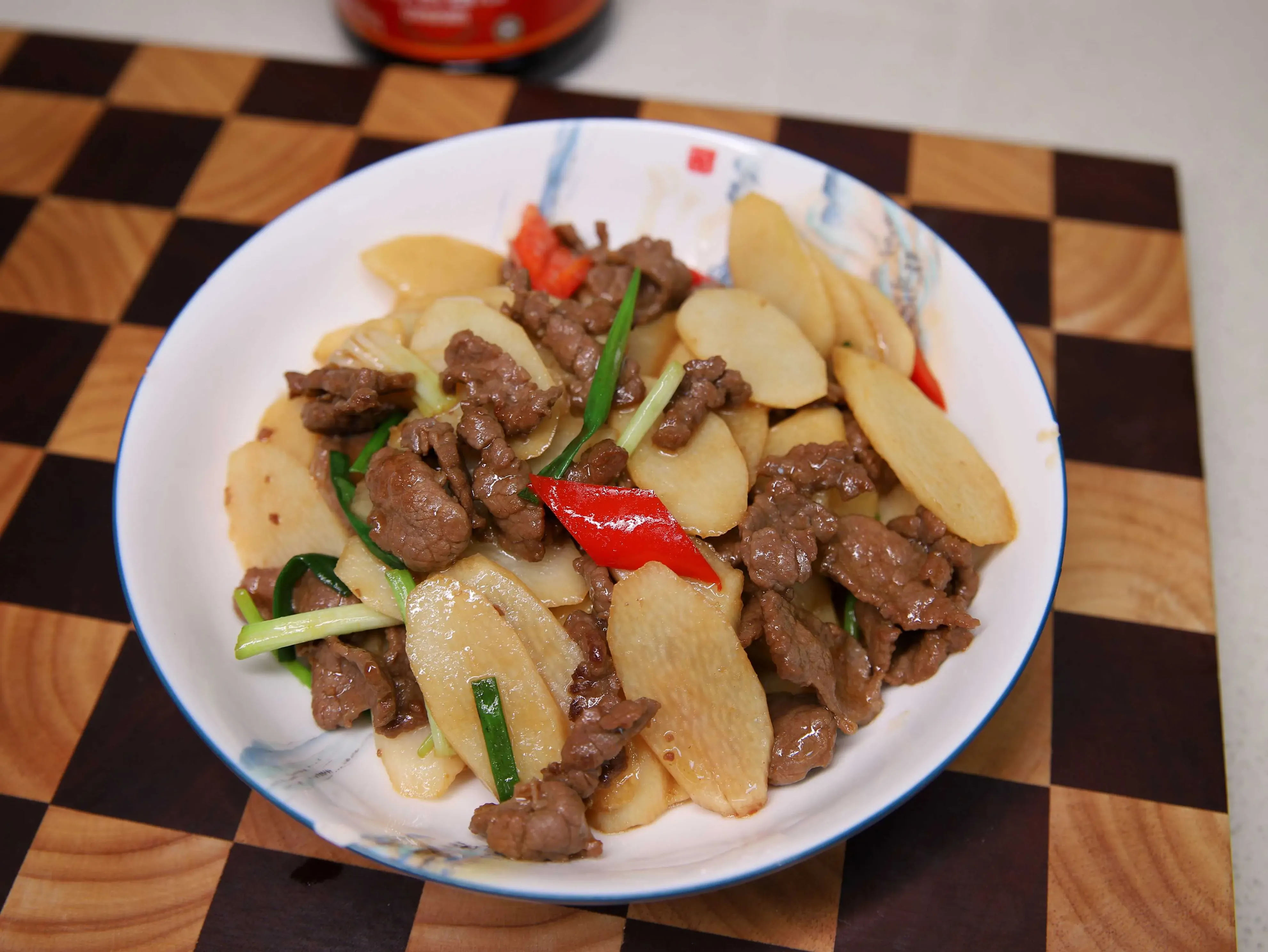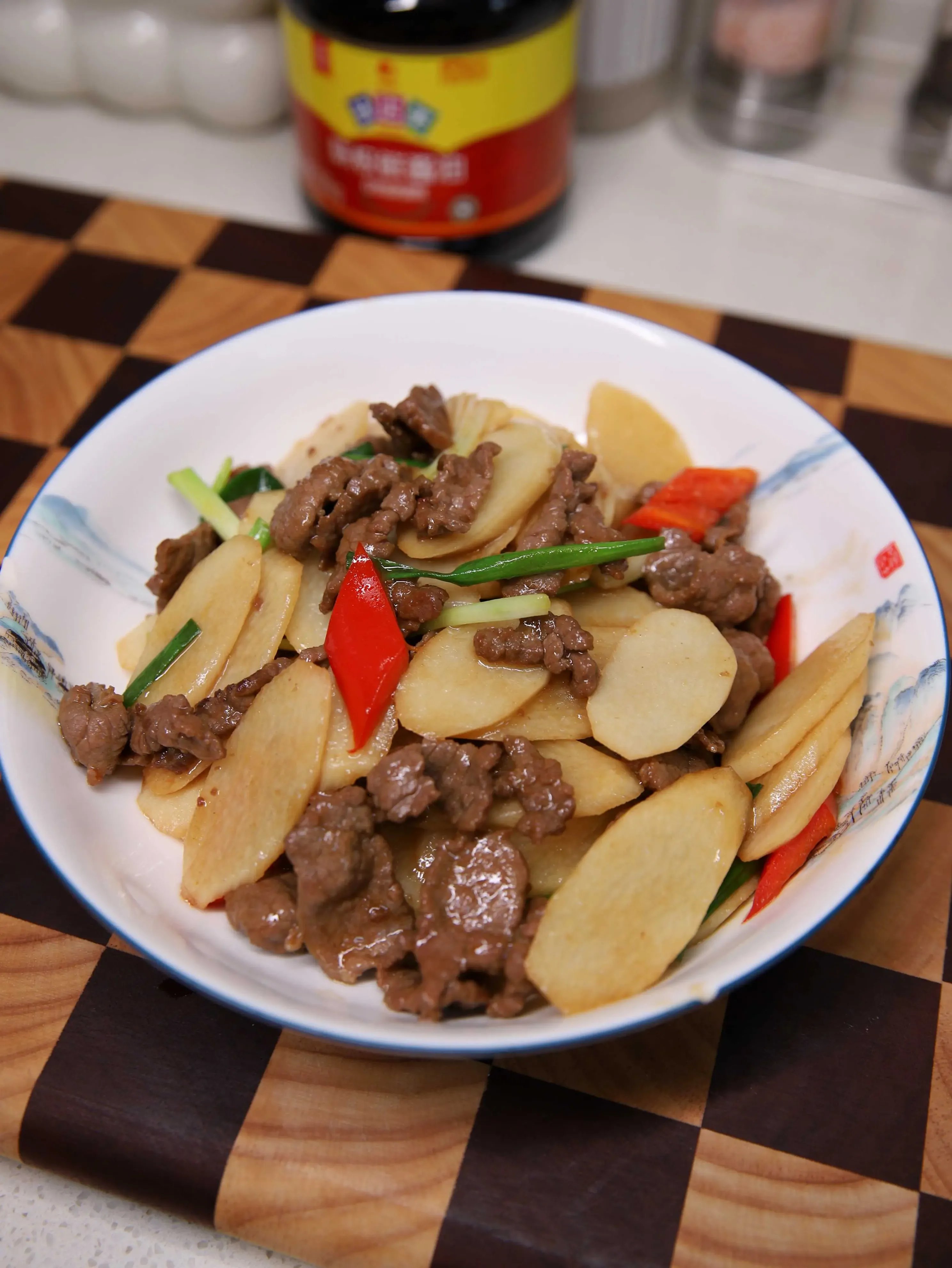 用料:铁棍山药一根,牛里脊肉一块,小葱两根,红辣椒半只,盐少许,生抽一勺,蚝油一勺,白胡椒粉一勺,生粉一勺。