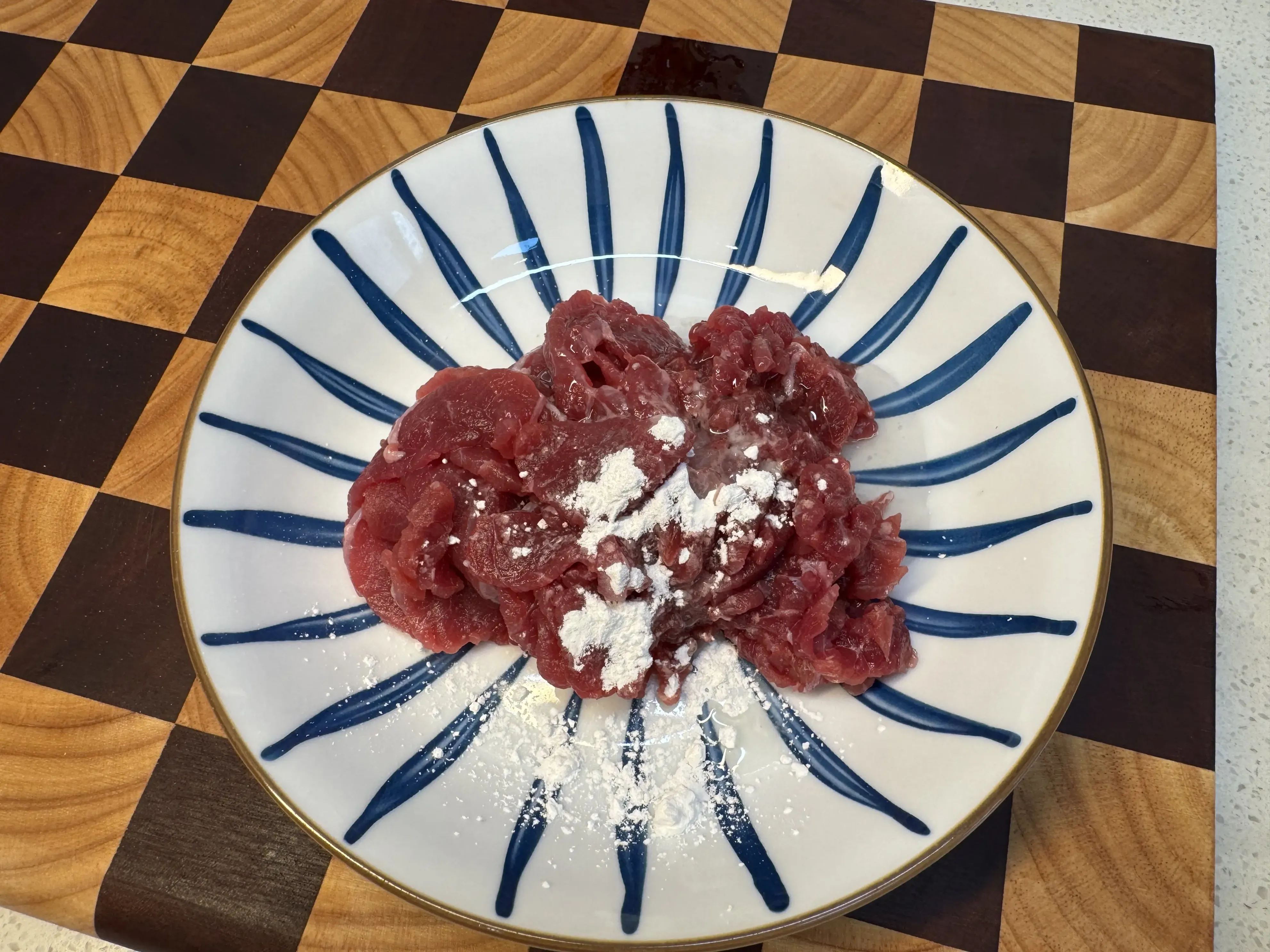 1,牛里脊肉一块,逆着肉的纹理切成薄片,大约一元硬币厚度即可,加一勺生粉,一勺食用油,抓拌均匀备用。