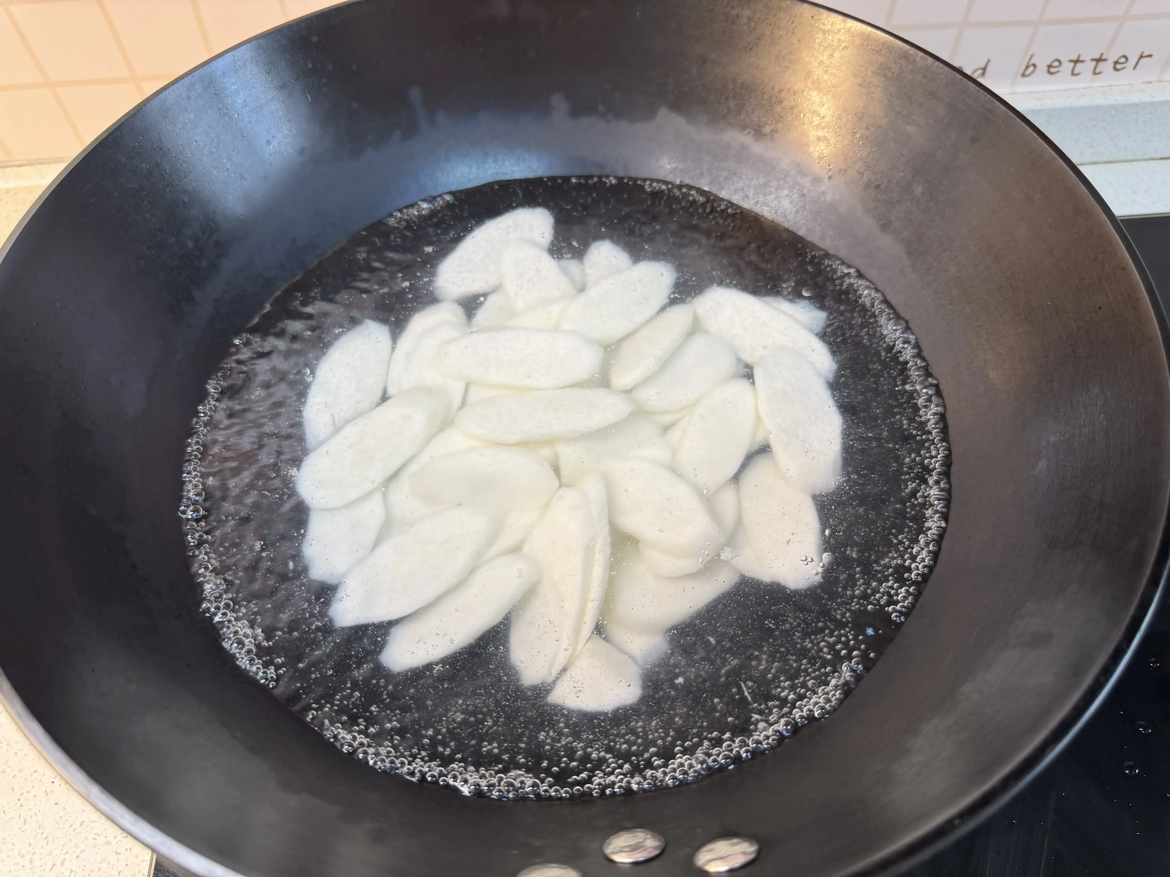 2,山药去皮,切成不薄不厚的片状,水开厚下锅煮两分钟,捞出来备用。