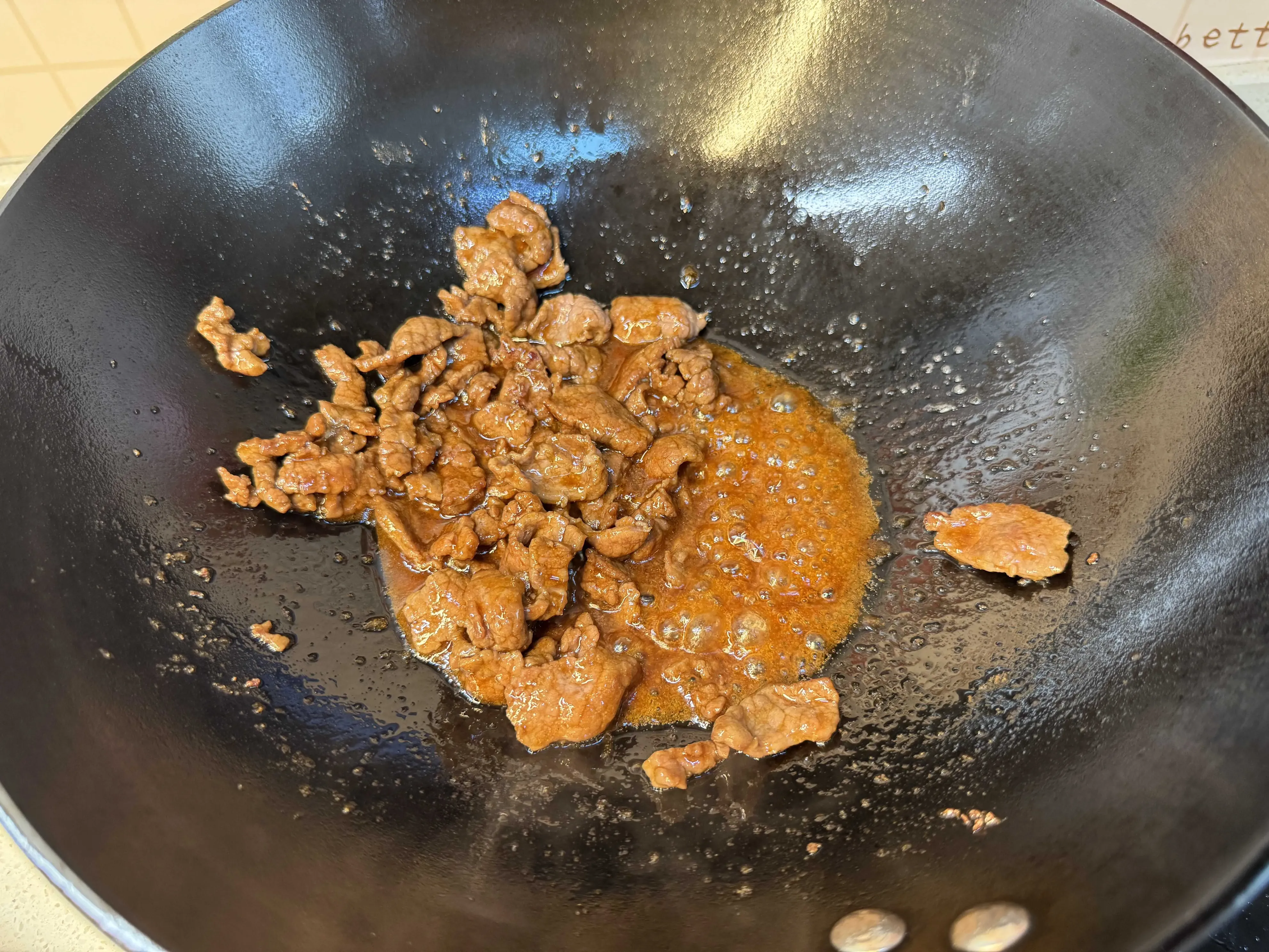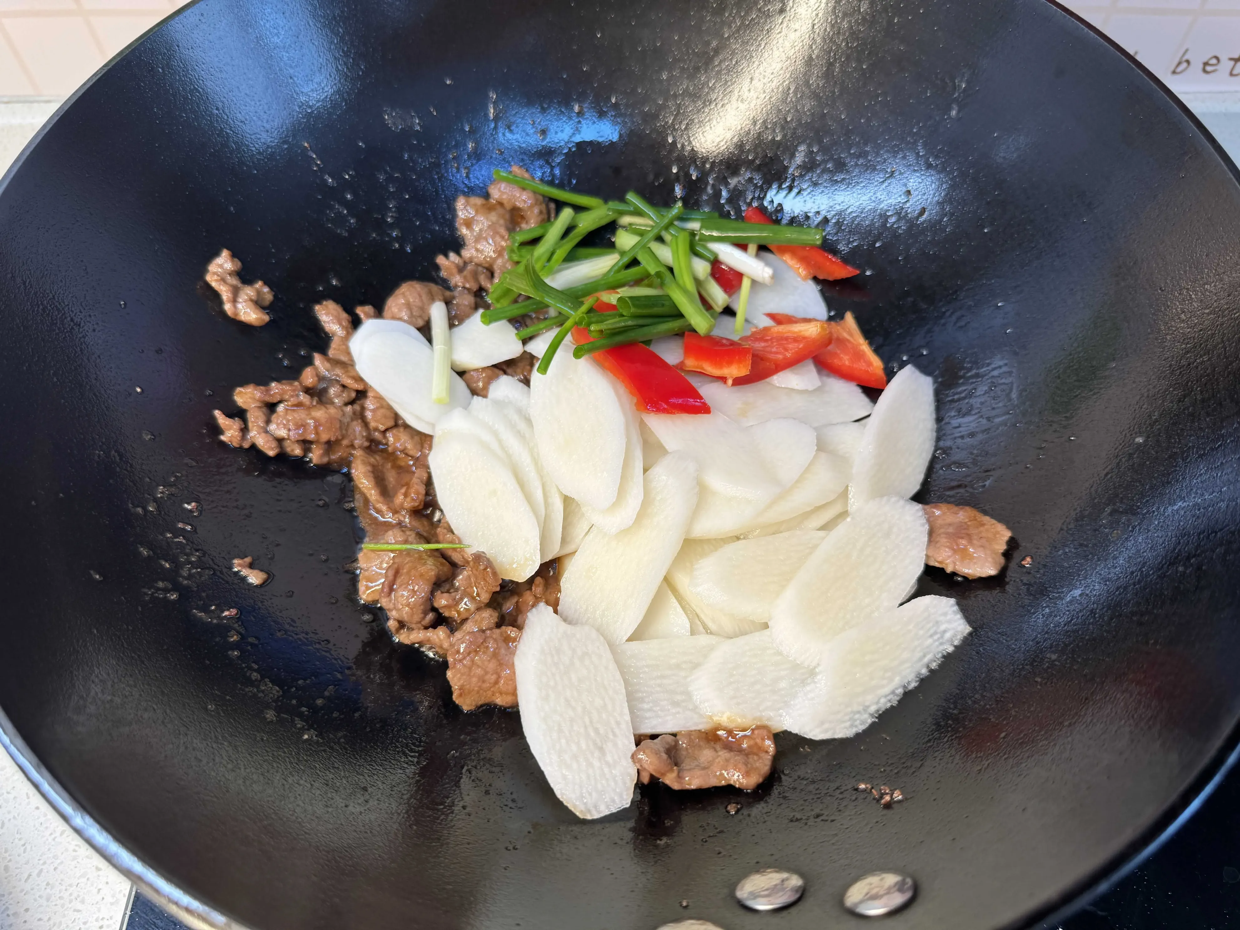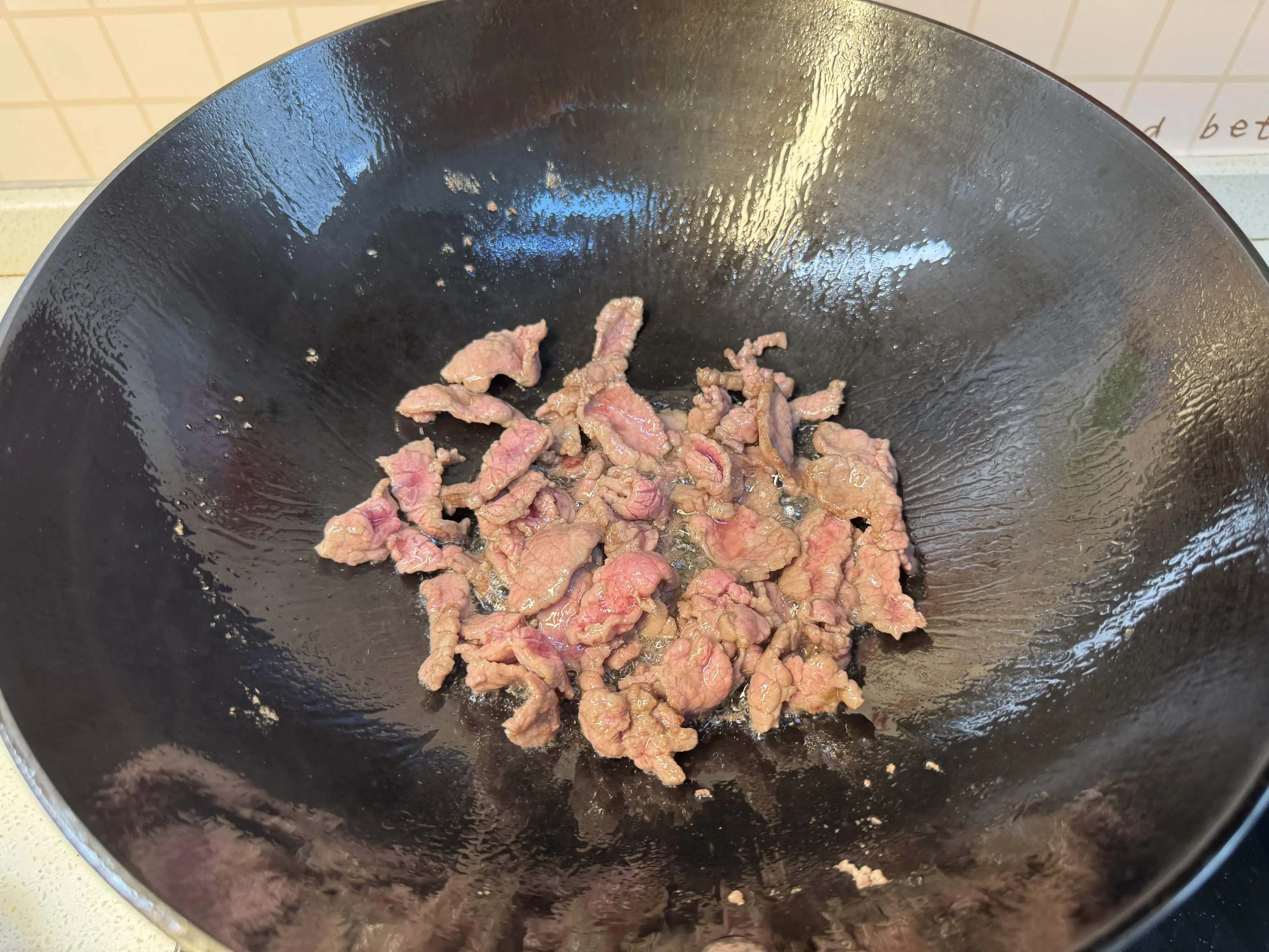 3,油锅烧热以后下入牛肉片,快速翻炒至牛肉变色。