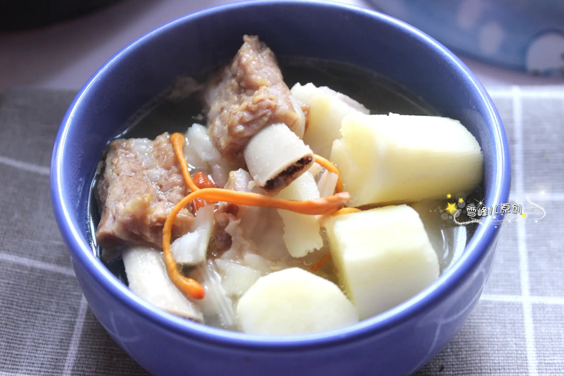 所用食材:排骨适量,山药1根,虫草花适量,葱段少许,姜片少许,盐适量,枸杞少许,当归、黄芪。