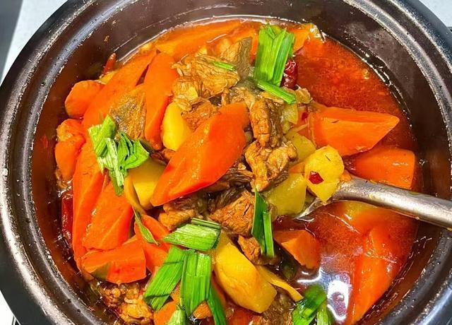 4、先加入胡萝卜块,煮十分钟(胡萝卜比土豆难煮熟一点),然后加入土豆块,继续煮20分钟左右,直至土豆软烂,最后撒上大蒜叶子。