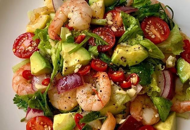 食材:虾仁150克、蔬菜约200克 (洋葱50克、生菜50克、小番茄100克)可根据自己喜好选择、牛油果1个(约150克);柠檬半个(可用柠檬汁1勺替代)加蒜、小米辣、香菜适量、生抽、1勺加零卡糖5克、可食用橄榄油5克、柚子醋2勺(可用普通醋替代)、盐、黑胡椒适量
