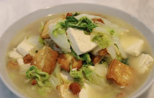 4、热锅凉油(熬猪油渣的油),小火放入猪油渣,再放入葱姜蒜末煸出香味儿,转大火,立刻放入白菜帮,炒蔫儿后放入白菜叶继续不断炒,放入鸡汤或者清水,加入豆腐,烧开后,加入两茶匙盐,转小火盖盖焖三分钟左右。