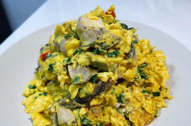 3、炙锅,热锅冷油,菜籽油烧热,加熟猪油,待油温至六成时倒入蛋液,转大火,先不要动,等一面定型微微焦黄时用锅铲沿一边拨动,转中火,反复多次待蛋液凝固后装盘。成菜时,生蚝块包裹鸡蛋,香气扑鼻,非常适合家庭聚会且老少皆宜。