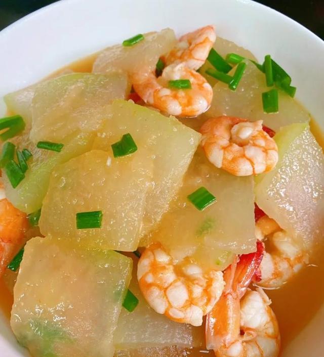 冬瓜含水量高,清淡解腻,还能帮身体补水,虾仁低脂高蛋白,口感 Q 弹,老人小孩都爱吃,消化吸收无压力。