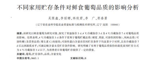 不同家用贮存条件对鲜食葡萄品质的影响分析 吴限鑫,李丽娜,林秋君,李 广,郭春景 辽宁农业科学 2025-08-12