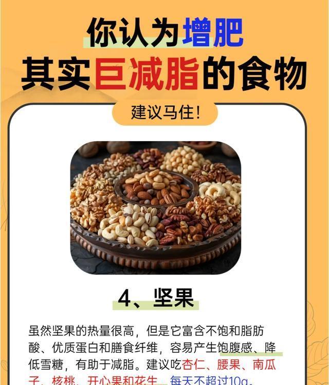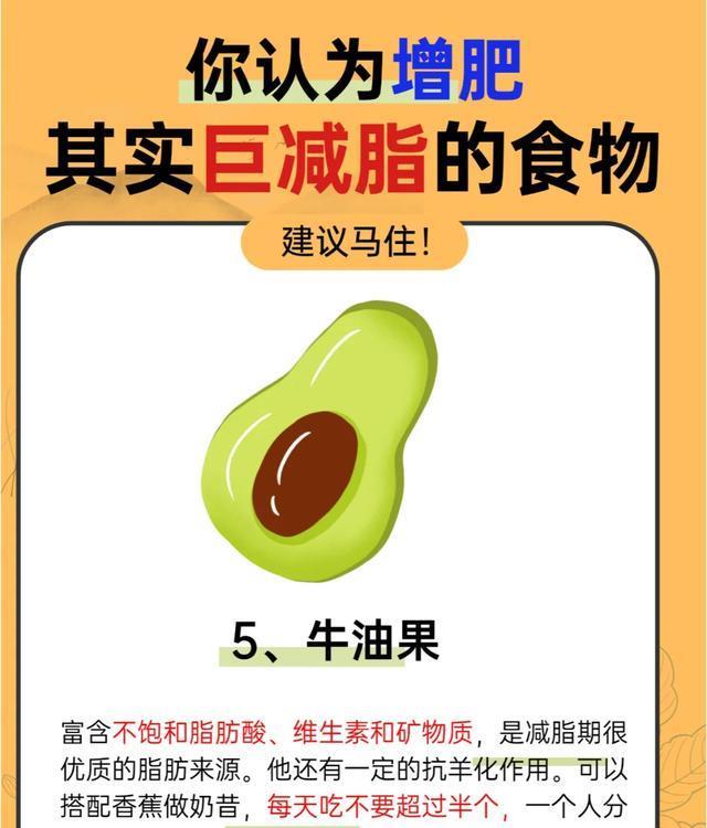 在这个颜值即正义的时代,每个人都希望自己拥有完美的身材。为了达到这个目标,很多人在饮食上变得异常谨慎,生怕一不小心就踩到了“增肥”的雷区。然而,有些食物虽然在大家的印象中是“肥胖制造机”,实际上却有着意想不到的减脂效果。今天,就让我们一起揭开这些食物的神秘面纱,看看它们是如何在不经意间帮助我们减少体脂的。
