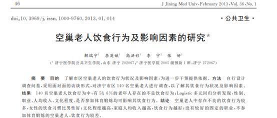 [1]解瑞宁,李英娥,高洪彩,等.空巢老人饮食行为及影响因素的研究[J].济宁医学院学报,2013,36(01):46-48.