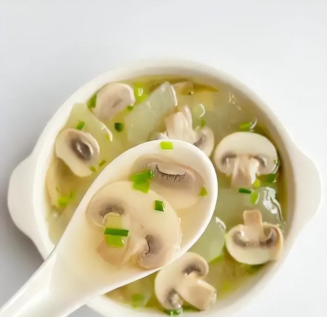 所需材料:口蘑(鲜蘑菇):150克;冬瓜:300克;大蒜:3瓣;姜:1小块;生抽:1勺;盐:适量;白胡椒粉:适量;食用油:适量;香葱:2根(切葱花);清汤或水:适量