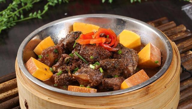 4. 准备蒸盘:在蒸盘底部铺上一层南瓜块,再将腌制好的排骨均匀地放在南瓜上面,确保南瓜和排骨能够接触到热蒸气。