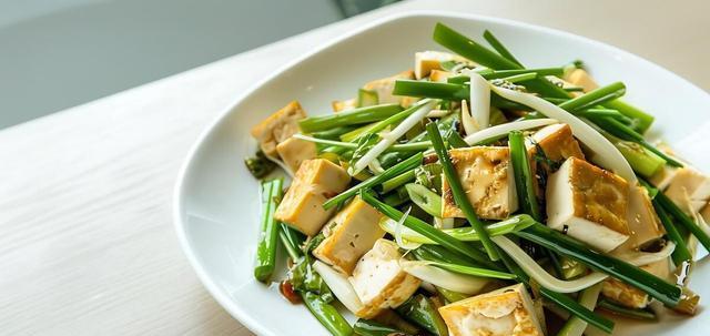 8. 装盘:炒好后,将韭菜豆腐盛出装盘,撒上少许葱花做装饰,完成。
