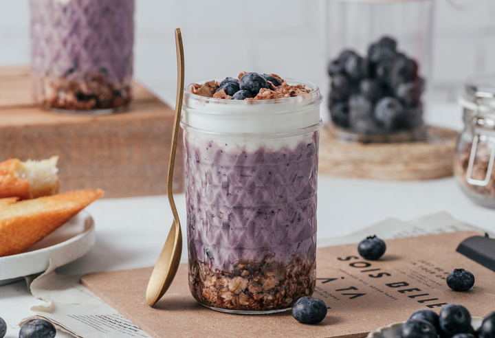 一、蓝莓酸奶麦片杯,这几样食物的融合,带给你一份健康清新的早餐。首先我们准备原料:蓝莓半斤、酸奶、蜂蜜、白糖、麦片、坚果、凉开水适量。