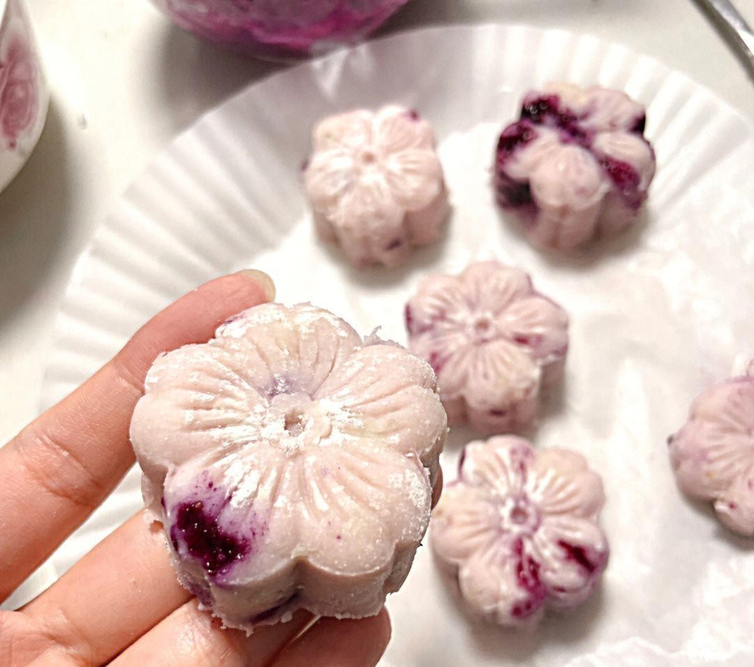 食材:山药200克,蓝莓100克,糯米粉100克,糖适量。