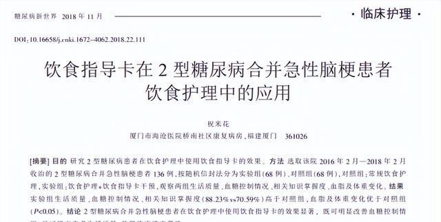 [1]祝米花.饮食指导卡在2型糖尿病合并急性脑梗患者饮食护理中的应用[J].糖尿病新世界,2018,