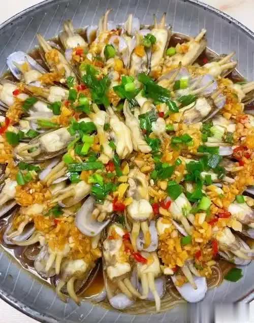 2. 蛏子过一下凉水,去壳,撕掉边上的黑线,整齐摆在盘子里。
