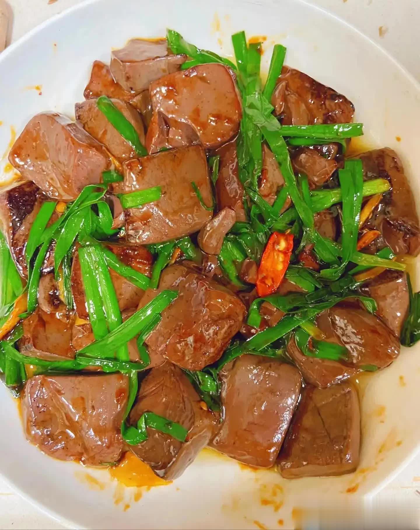 4. 合炒调味:倒入焯好的猪血和韭菜叶,轻轻颠锅或翻炒(避免猪血碎掉)。淋入一勺生抽和少许盐,快速翻炒均匀即可出锅。猪血滑嫩,韭菜辛香。