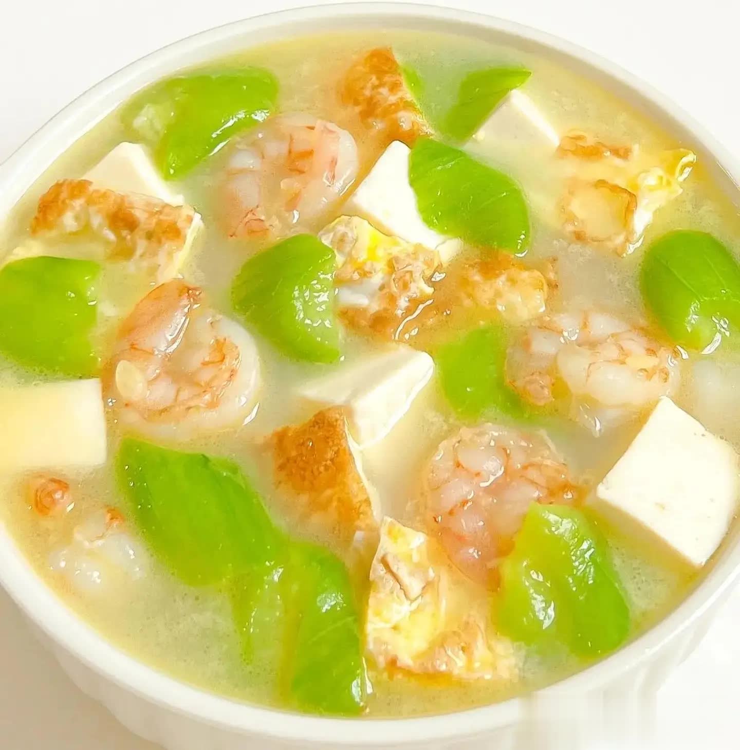食材:虾仁 200 克、豆腐 1 块、香菇、木耳、生姜、大蒜、盐、生抽、淀粉适量。