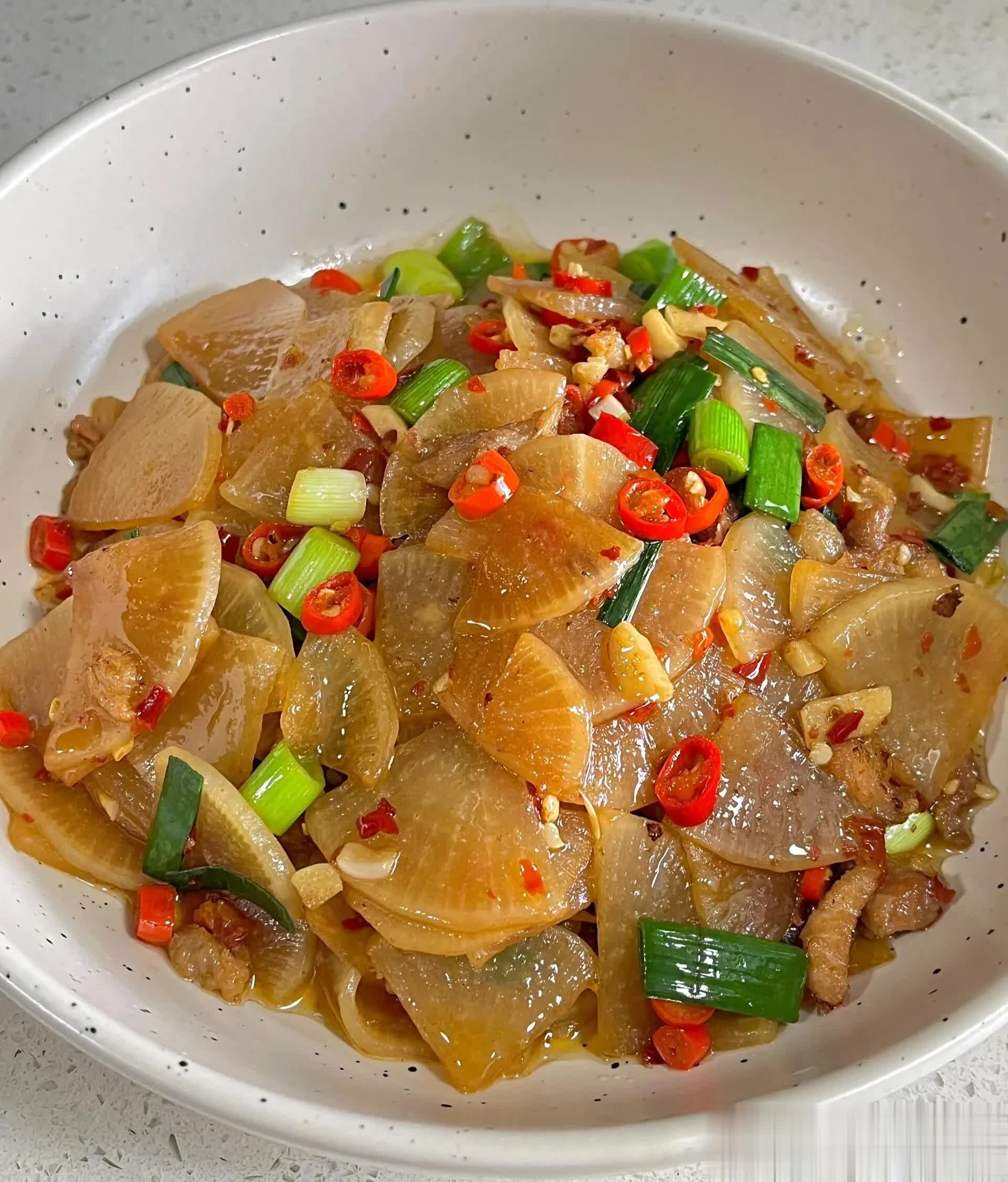 1. 白萝卜不去皮(营养更高,若皮硬可轻削外层),切成薄片;五花肉切片,蒜苗切段备用;