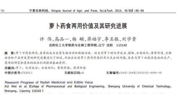 [1]许伟,高品一,杨頔,等.萝卜药食两用价值及其研究进展[J].宁夏农林科技,2014,55(02):90-94.