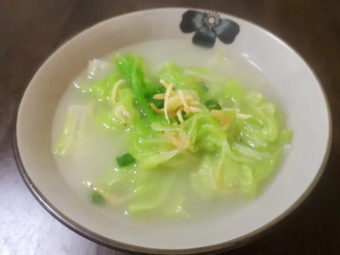 3、白菜撒进去,搅拌几圈,煮五分钟所以,煮得软一些更好吃,之后再撒点香葱,海米,些许盐,芝麻油,汤汁的味道调好关火。