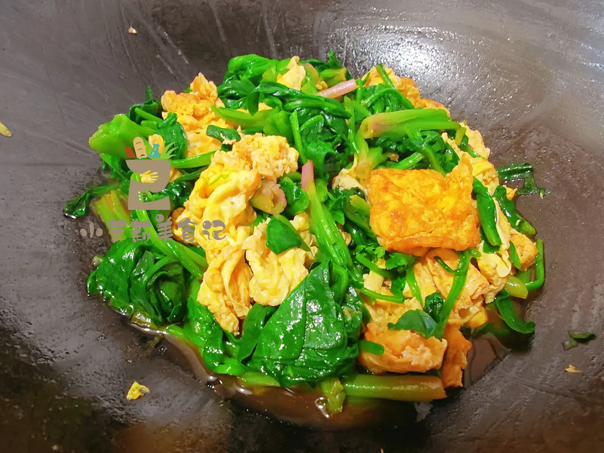 3、先在锅里倒点油,烧热后先倒些鸡蛋在里边,扒拉几下成型。菠菜撒进去,调些生抽,盐,再炒一炒,均匀入味即可关火出锅。