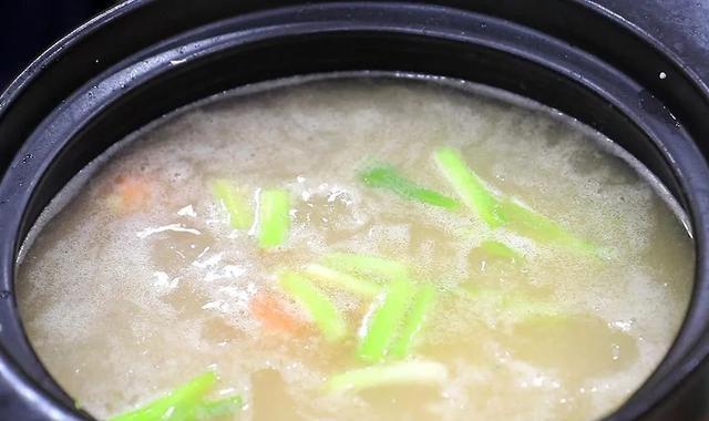 2.砂锅烧热,放入适量的植物油,油温五成热时放入葱段和虾头,小火煎出虾油,闻到香味以后倒入大半锅开水,然后放入冻好的大米,并顺着一个方向不停的搅拌,这样煮粥既能减少熬制时间又不会糊锅,大火烧开以后转小火熬制8分钟。