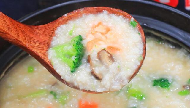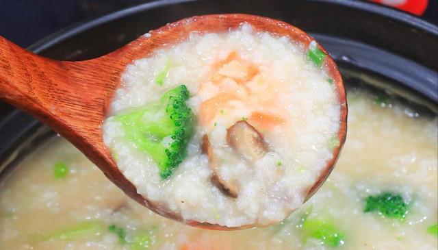 3.8分钟以后米粥已经非常绵香了,这个时候放入虾仁、香菇、西兰花和胡萝卜,中火继续炖煮3分钟,食材全部成熟以后加入食盐3克、胡椒粉2克调味,继续煮至沸腾,一道鲜香美味的鲜虾蔬菜粥就做好了,早上喝一碗,全天活力满满。