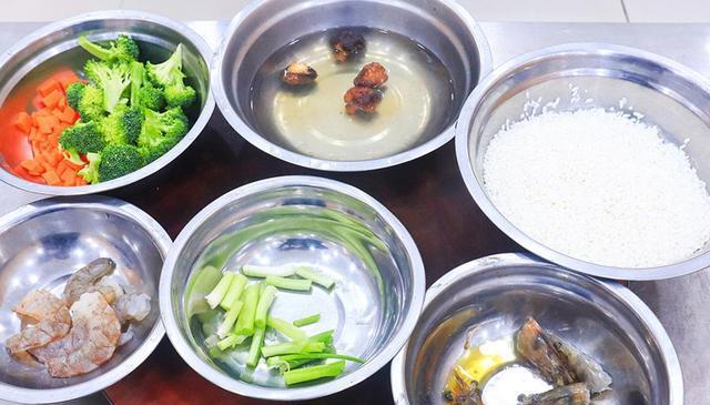 1.大米提前淘洗干净,放冰箱中冷冻三个小时,这样煮出来的粥更香滑软糯;适量的鲜虾剥出虾仁,虾头洗干净一会靠油;胡萝卜切成小丁;西蓝花打散、洗净;几个香菇泡发;再切断小葱段备用。