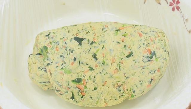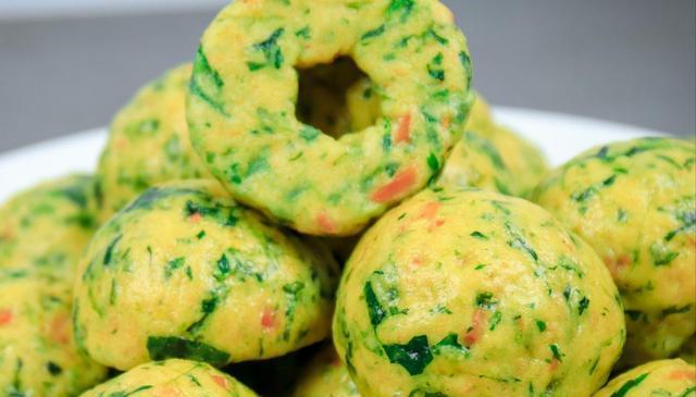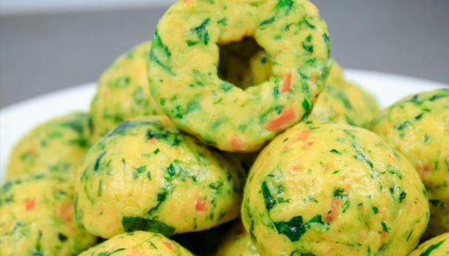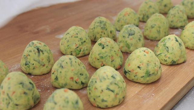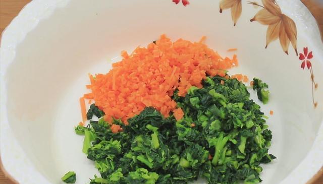 1.菠菜焯水后切碎,胡萝卜切成碎丁放在一起,加入玉米面200克、面粉100克、酵母3克、食盐2克。