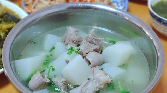 五、山药萝卜排骨汤: 山药和萝卜都富含营养成分,搭配排骨煲汤,能为身体提供丰富的营养,有助于增强体力和免疫力。