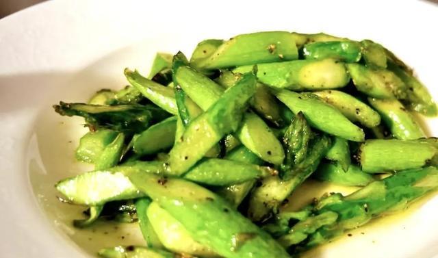 锅中倒油,油热后放入蒜末爆香,加入芦笋快速翻炒,加入适量盐、生抽调味,翻炒均匀即可出锅。