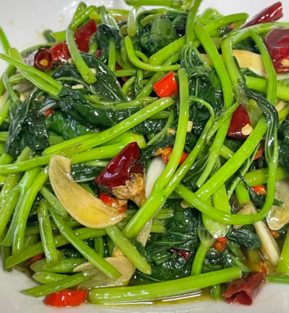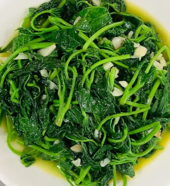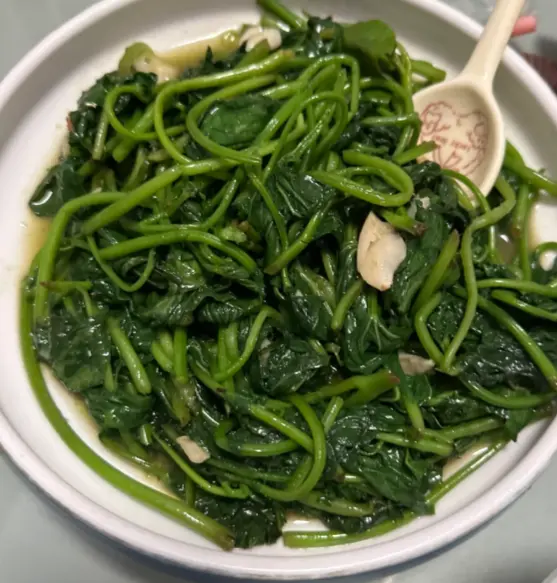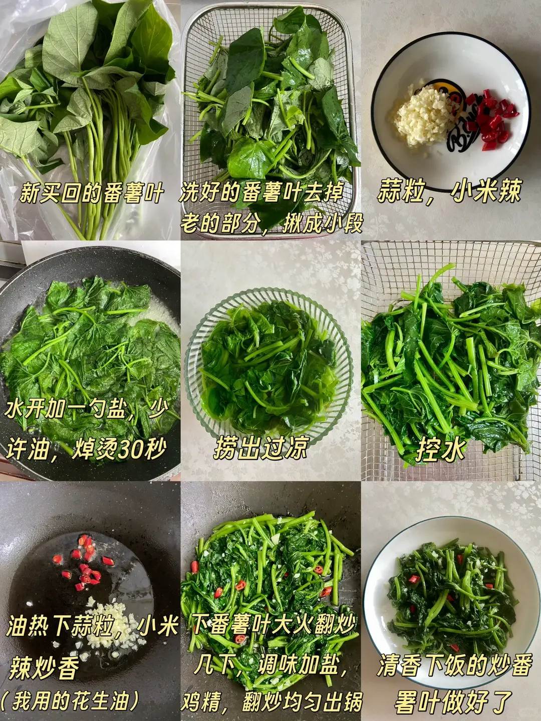很多人觉得红薯叶有涩味、口感毛糙,那是没做对。正确做法是:选取鲜嫩的叶片,用淡盐水浸泡10分钟,然后快速焯水15秒,捞出过凉。这样能去除涩味,让口感更顺滑。推荐一道经典快手菜:蒜蓉清炒红薯叶。
