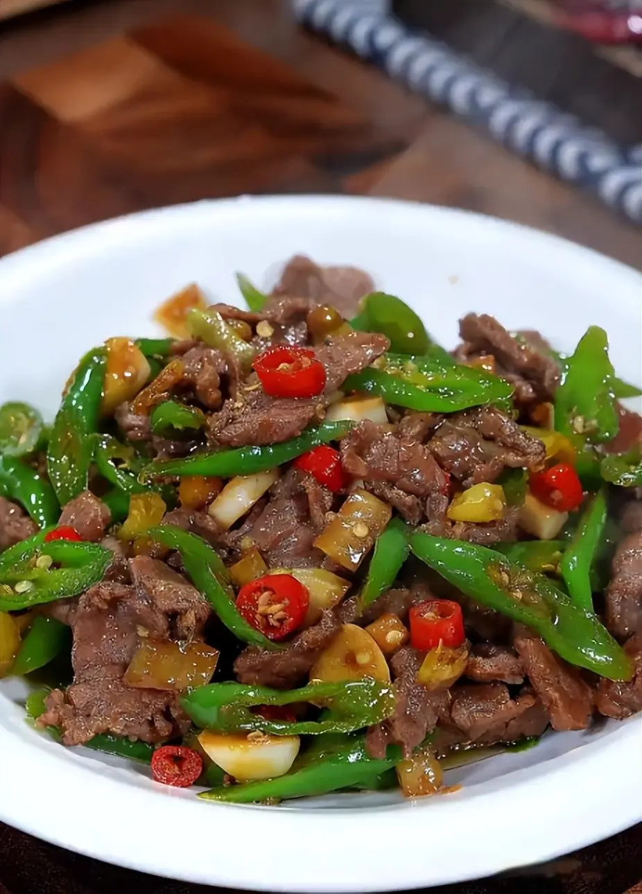 5. 倒入青椒块,继续大火翻炒1分钟,至青椒断生、颜色变深。
