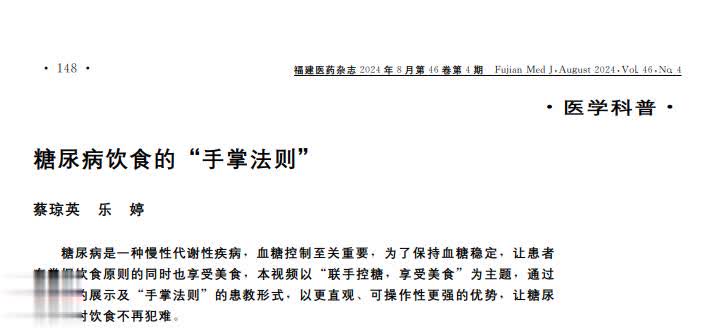 [1]蔡琼英,乐婷.糖尿病饮食的“手掌法则”[J].福建医药杂志,2024,46(04)