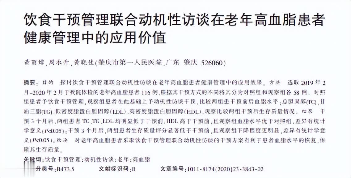 [1]黄丽嫦,饮食干预管理联合动机性访谈在老年高血脂患者 健康管理中的应用价值,现代诊断与治疗,2020-12-08