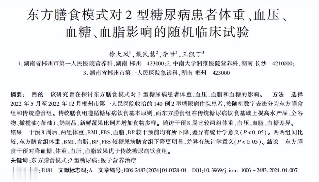 [1]徐大凤.东方膳食模式对2型糖尿病患者体重、血压、血糖、血脂影响的随机临床试验,公共卫生与预防医学,2024-07-12