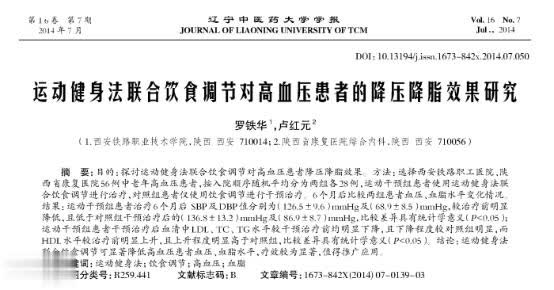 [1]罗铁华.运动健身法联合饮食调节对高血压患者的降压降脂效果研究,辽宁中医药大学学报,2014-07-01