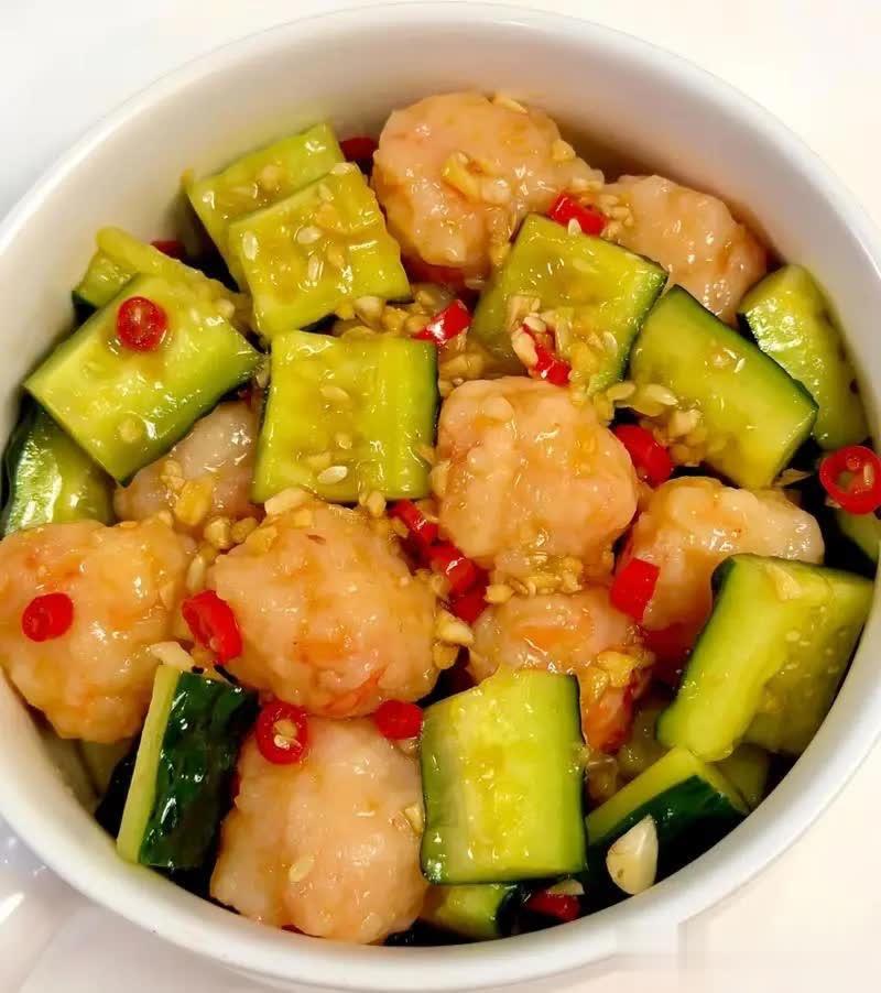 4. 混合:将冷却的虾滑球和黄瓜段混合,淋上调好的料汁,翻拌均匀即可。冰镇后风味更佳。