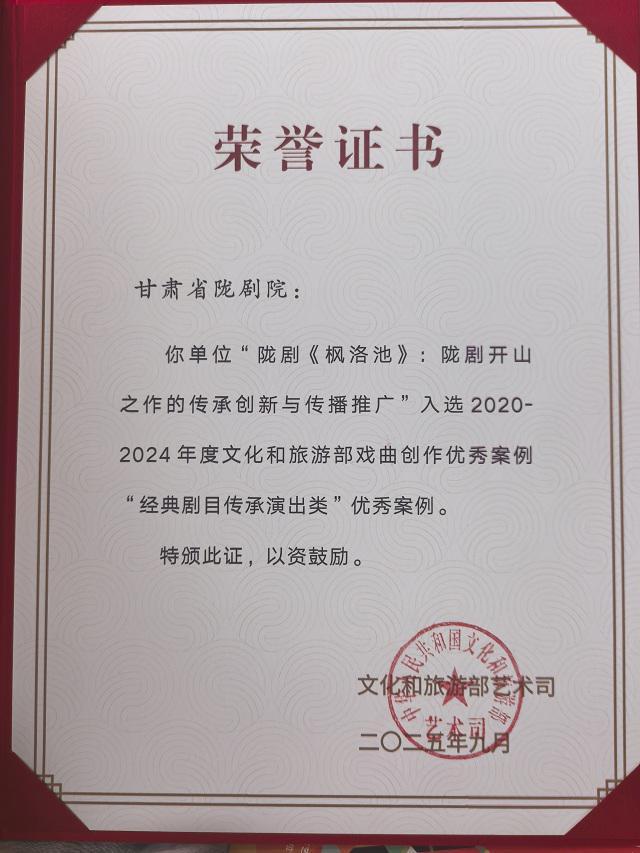 与此同时,从盛典组委会再度传来令人振奋的喜讯——甘肃省陇剧院奠基之作、经典剧目《枫洛池》的传承创新与演出推广实践,成功入选2020-2024年度文化和旅游部戏曲创作优秀案例“经典剧目传承演出类”优秀案例。这不仅是对甘肃省陇剧院数代艺术工作者坚守传承、不懈努力的高度肯定,也是对陇剧这一地方剧种在新时代焕发勃勃生机的权威认可。