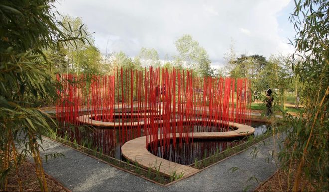 作品以“外方内圆”为空间结构,融合中国传统造园哲学与现代生态技术。通过对角穿越方形水池的曲线木栈道,以及水中直立的红色竹丛,创造出宁静深远的氛围。